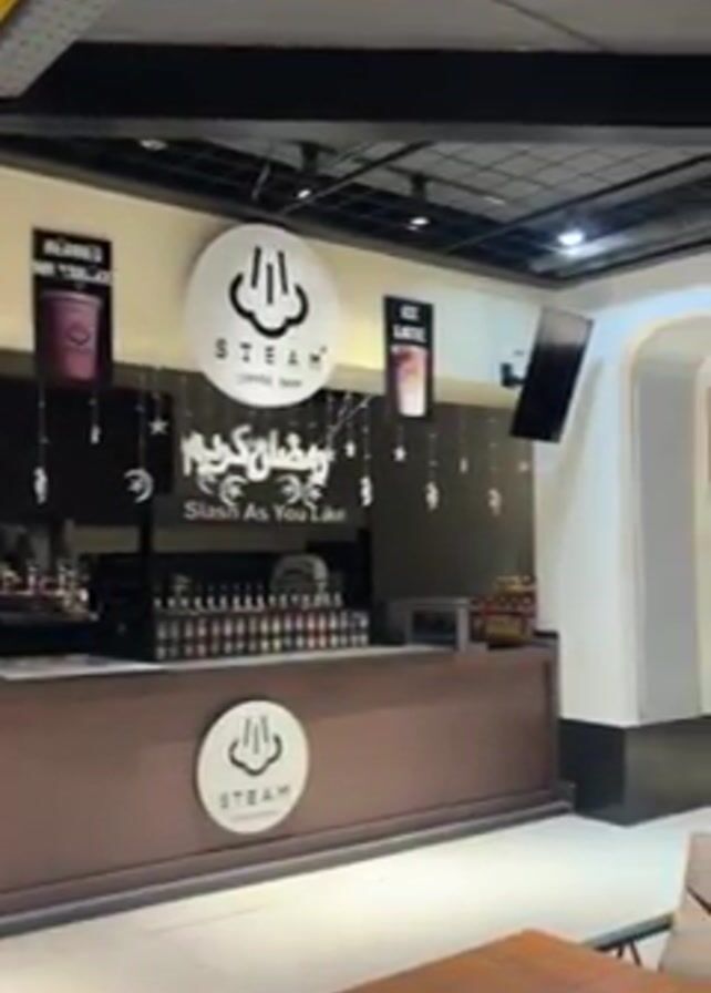 The camera pans across the front of a coffee shop called Steam. There is a counter with drink products lined up on it. Behind the counter is a black wall decorated with stars and moons. The words "Ramadan Kareem" are written on the wall in Arabic. A table is in the foreground. The lighting is bright.