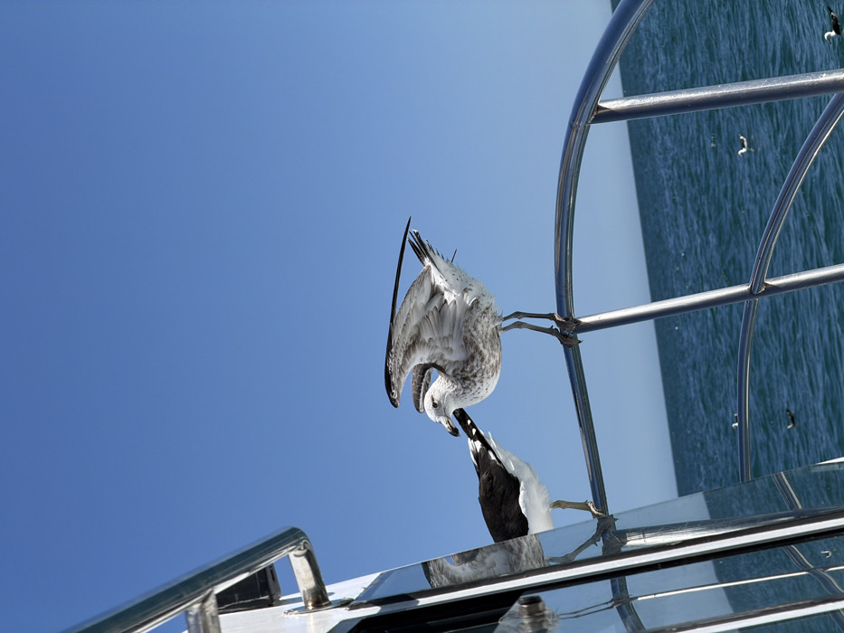 The image depicts a marine scene offshore within the Overstrand Local Municipality, South Africa, under a clear blue sky. No human subjects are present. Two seagulls are prominently featured on a boat. A juvenile gull, exhibiting mottled light grey and white plumage with partially spread wings revealing black primary feathers, stands on a curved, polished stainless steel boat railing on the right. An adult gull, characterized by a white body and black dorsal plumage, is positioned on a reflective vertical surface of the boat's cabin structure on the left, facing the juvenile. Both gulls are in close proximity. The background consists of deep blue ocean water with minor surface ripples, on which several smaller, dark-feathered birds are observed floating in the distance. The boat's white cabin structure and stainless steel railings are visible. The scene is brightly illuminated by natural light.