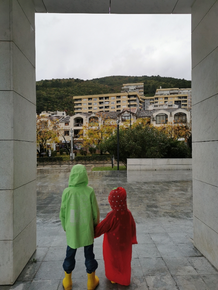 Two individuals, observed from behind, stand framed within an archway or opening of a light-colored, stone-clad building in Budva, Montenegro, looking out onto an urban landscape on an overcast day. The taller individual, positioned on the left, wears a light green hooded raincoat with "CORE" visible on the back, blue pants, and bright yellow rain boots. The shorter individual, on the right, wears a red hooded raincoat with white polka-dot patterning, resembling a strawberry, and yellow footwear. They are holding hands. The immediate foreground consists of grey, square-tiled paving stones, which are wet and reflective, indicating recent precipitation. Beyond the individuals, the wet paved area extends to a low, dark fence or railing, bordering a strip of green grass and several deciduous trees with yellow-orange autumn foliage. A streetlamp is visible within this mid-ground area. In the background, a row of multi-story buildings with arched windows and red-tiled roofs is visible. Behind these structures, a steep, densely vegetated hill rises, upon which multiple larger, modern apartment buildings, predominantly light beige, are situated. The sky above is uniformly grey and overcast.