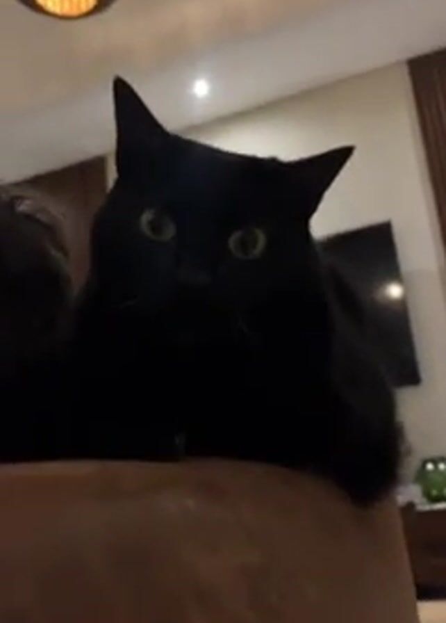 black cat sitting on a brown suede-like surface, possibly a couch or chair. The cat is the main subject, filling much of the frame with its head and upper body. It has bright yellow-green eyes and a sleek, short coat. Behind the cat, in the out-of-focus background, is an interior setting. There is dark hair visible on the left edge of the frame, suggesting a person is nearby. The background includes a beige wall, vertical wood-look paneling, a flat-screen TV mounted on the wall, a small wooden side table with a green decorative object, and hardwood flooring. An ornate, woven-style light fixture hangs from the ceiling. The lighting in the room appears to be a mix of natural and artificial, creating shadows. The camera angle is low, looking up at the cat.