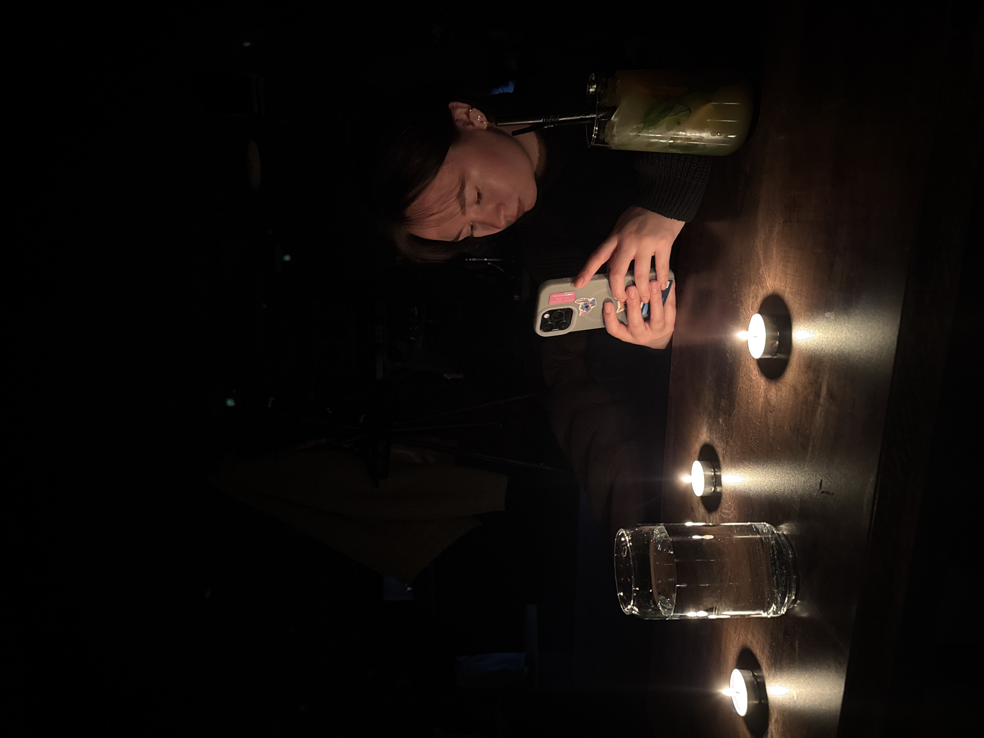 A dimly lit scene depicts a woman using a smartphone at a table illuminated by candlelight