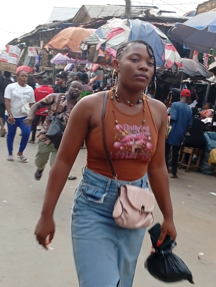 A woman in a brown tank top and denim skirt walks through a bustling outdoor market. She wears large hoop earrings and a beaded necklace, carrying a small pink purse and a black plastic bag. Behind her, blurred figures move through the crowded scene, with numerous stalls and awnings overhead. The chaotic market environment is filled with people and various goods.