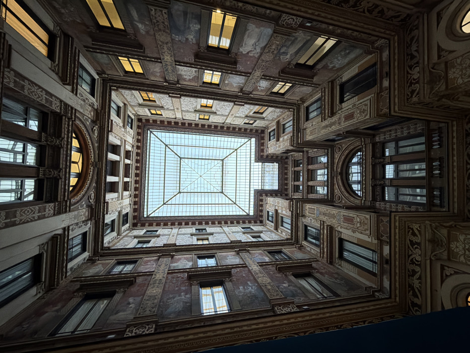 - "An upward shot reveals an interior courtyard capped by a glass ceiling, framed by walls adorned with intricate frescoes and windows" by FM-u366Z2, licensed under CC BY 4.0
