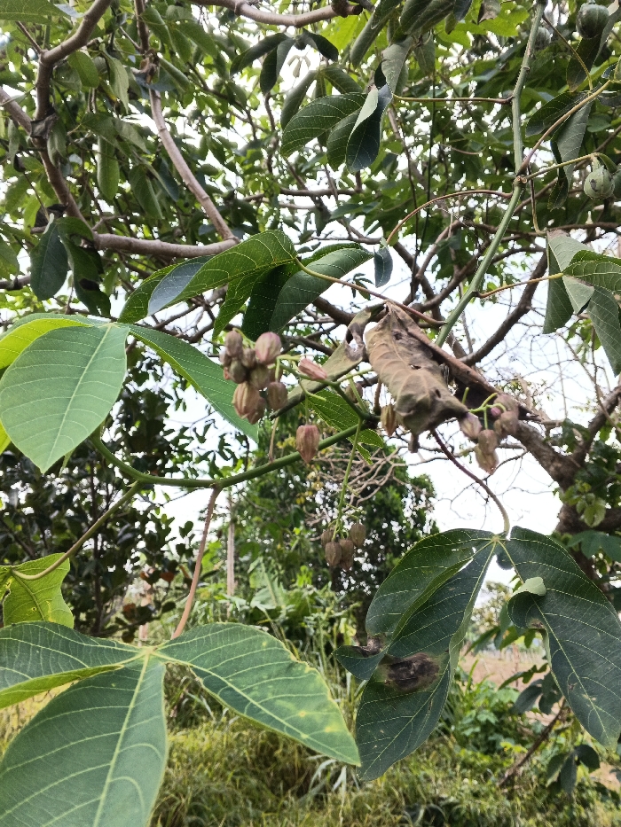The image displays a close-up, upward-angled view of a tree or large plant located in Chengdu, China. The scene is dominated by green foliage, featuring multiple broad, multi-lobed leaves with visible venation, some exhibiting minor yellowing or brown desiccation. Several clusters of light brown, ribbed, bell-shaped or lantern-like seed pods are suspended from the branches, each cluster containing multiple individual pods. The branches themselves are slender, varying in color from light brown to green. The background is blurred, showing additional green vegetation and a bright, possibly overcast, sky. No human or animal subjects are present within the frame.