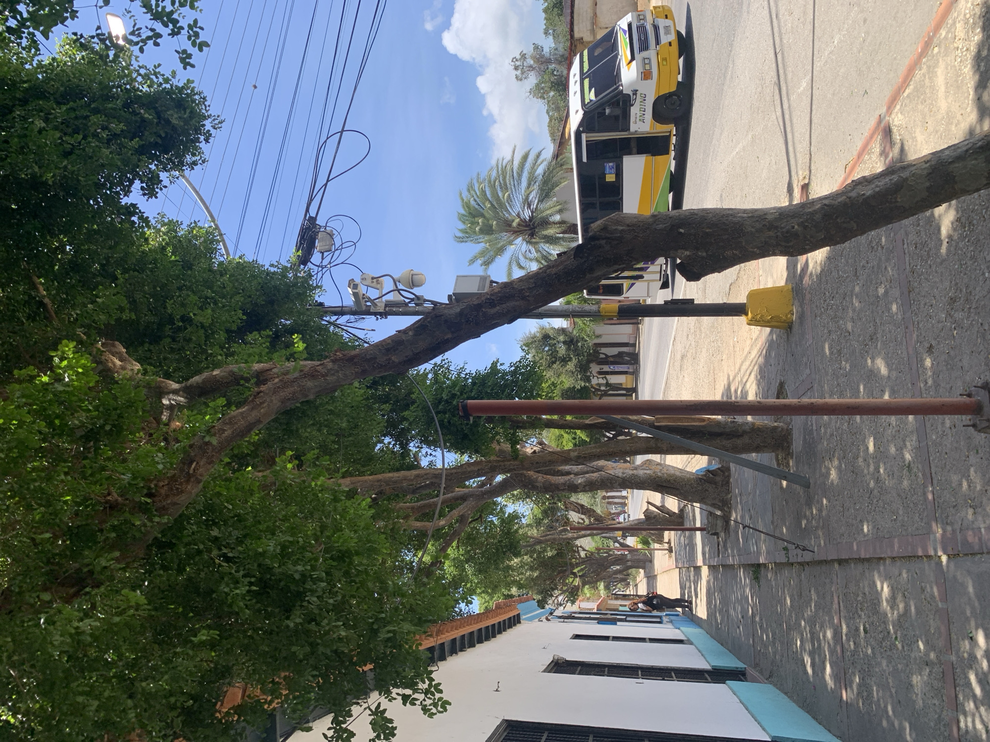 This image depicts a street scene in Tacarigua, Venezuela. The viewpoint is from the sidewalk, looking down the street. A row of mature trees with broad canopies lines the sidewalk, their branches arching across the street. Power lines and streetlights are visible above the trees. A white and yellow bus is parked on the right side of the street. Buildings are on the left side of the image, with white facades, blue trim, and dark window frames. The sidewalk is paved with concrete and some brick edging, marked with shadows cast by the trees. A person is lying on the sidewalk near the buildings. Road safety structures run parallel to the pavement. A palm tree is visible among the other trees. The sky is blue with scattered clouds.