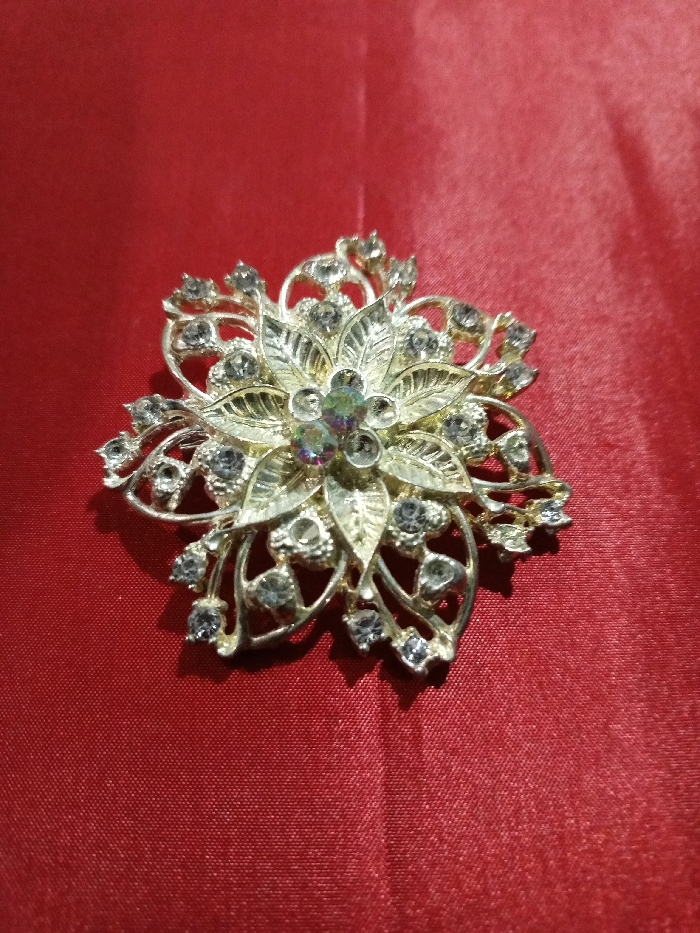 - "A silver-toned metallic brooch with a multi-petaled floral and leaf-like design is depicted, resting on a deep red, slightly wrinkled fabric surface" by FM-jp5zv1, licensed under CC BY 4.0