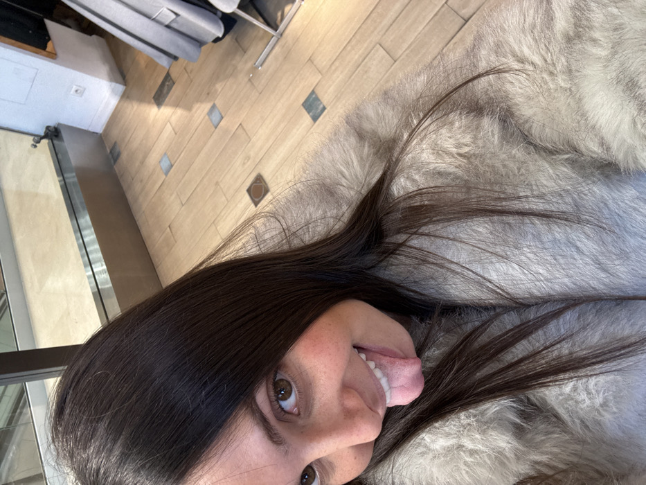 A close-up, chest-up vertical photograph captures a female subject in an indoor commercial environment. The subject has long, dark brown hair, brown eyes, and visible freckles on her nose and cheeks. She presents a wide smile, extending her tongue playfully towards the camera. She is clad in a light-colored, possibly off-white or light grey, faux fur coat. The background reveals a floor constructed from light-toned wooden planks, interspersed with rectangular inlays of darker, potentially grey or reddish-brown, material. Behind the subject's head, a reflective surface, consistent with a display window or mirror, shows interior reflections. To the upper right, a segment of a white wall with a European-style electrical outlet is visible, adjacent to a grey garment hanging on a metallic clothing rack. The setting implies a boutique or retail establishment. The specific location within the city of Cannes, France, is not identifiable from the image.