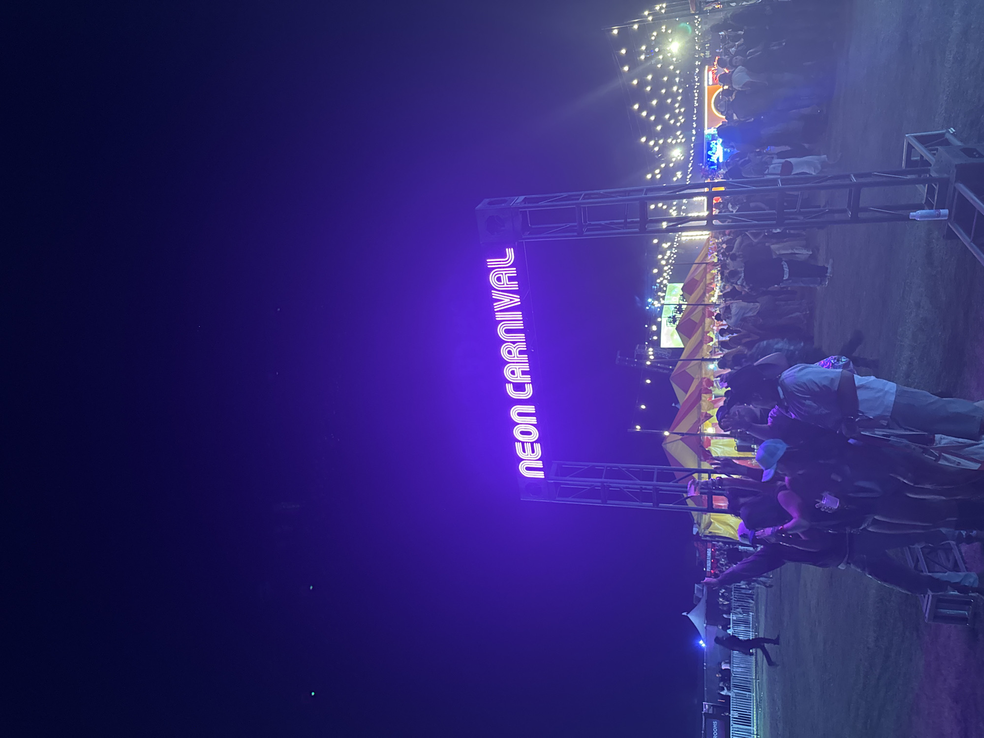 The image captures a nighttime scene at the "Neon Carnival" event in Thermal, California