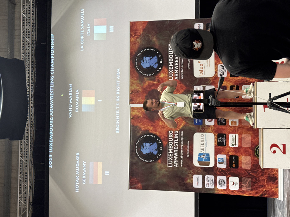An image shows a display at the 2025 Luxembourg Armwrestling Championship with the competitor list for the Beginner 75 kg Right Arm category, featuring: Hotak Mudaser (Germany), Vasiu Marian (Romania), and La Corte Samuele (Italy). Next to the display is a banner for the Luxembourg Armwrestling Federation, which promotes the event and sponsors like Aredilux and Lalux. A man standing on a podium in front of the banner is seen posing for a picture.