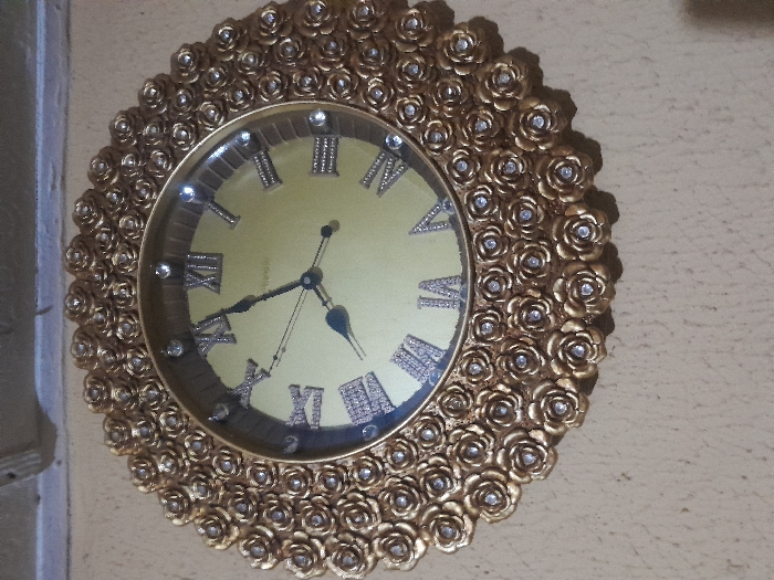A decorative gold-colored clock with Roman numerals hangs on a beige wall. The clock face is round with a metallic gold border and shiny hour markers. Its ornate frame is adorned with numerous small gold roses, each embellished with a tiny sparkling gem. The hands indicate the time is approximately 4:20. The clock is positioned slightly off-center in the frame, with a portion of a light-colored object visible to the left.