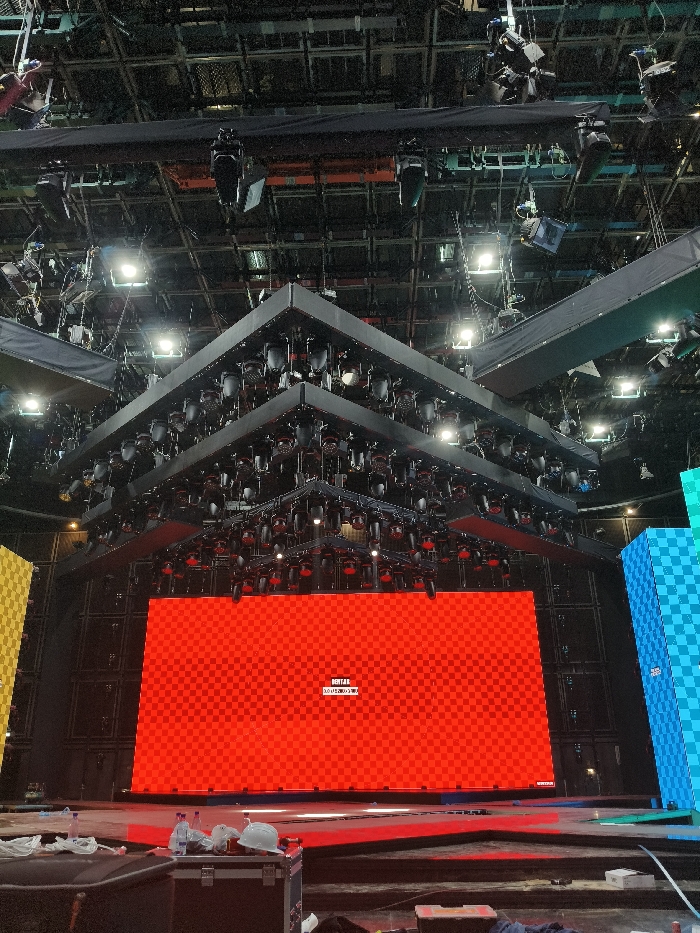 A large indoor venue showcases a stage with a central red LED screen displaying text. Above the stage, a complex structure holds numerous stage lights in a tiered, geometric pattern. Other colored screens are visible on the stage's periphery. The ceiling is packed with equipment, including more lighting fixtures. A stage is in the foreground with a variety of bottles and what appears to be a white construction helmet.