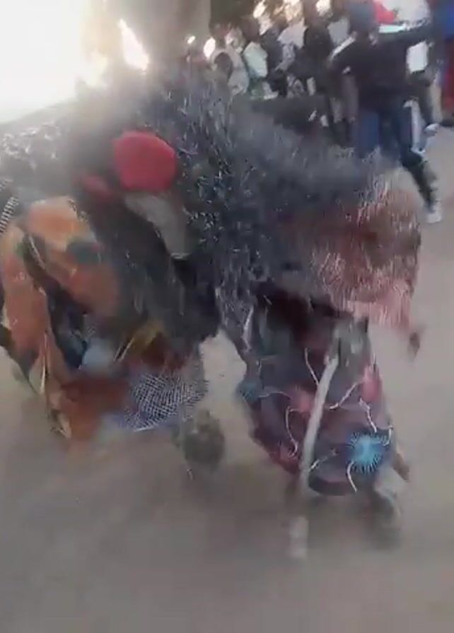 A group of people are gathered in an outdoor setting, possibly a village or community space. The focal point of the video is a large, costumed figure moving within the crowd. This figure is adorned with a complex outfit featuring what appears to be faux fur or similar material on its head and back, colorful patterned fabrics, and possibly other decorative elements. Several people are seen observing or interacting with the costumed figure. The environment consists of a sandy or dirt-covered ground, trees, and buildings in the background. The scene seems to be shot with a wide-angle lens, creating a slightly distorted perspective.