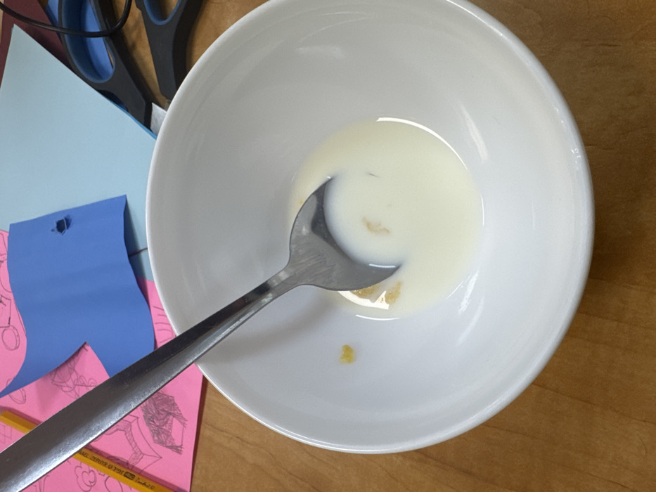 The image depicts a white ceramic bowl containing remnants of a meal, resting on a light-colored wooden surface within the Gilboa Regional Council, Israel. Approximately 2-3 tablespoons of white liquid, consistent with milk, are visible at the bottom of the bowl, along with several irregular yellowish-brown solid particles, likely cereal. A silver-colored metal spoon is positioned within the bowl, with its handle extending towards the upper left and its head partially submerged in the liquid. In the upper left background, a yellow pencil rests on a pink piece of paper featuring black line drawings, including what appears to be a chair and a graduation cap. Towards the upper right background, a blue piece of paper, cut into an irregular shape resembling a flag with a small circular perforation, is visible, alongside a lighter blue paper, a pair of black-handled scissors, and a black electrical cable. No individuals are present in the scene.