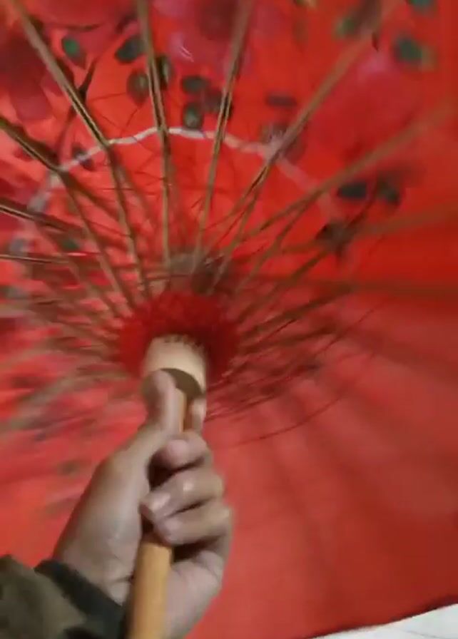 A person holds a red parasol by its wooden handle, turning it around so the camera looks up into the inside of the parasol. The red canopy has a floral pattern and a wooden and string frame. The person is wearing a dark jacket. The floor is tiled.