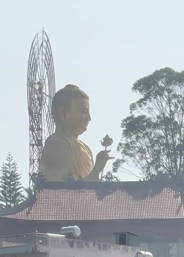 golden Buddha statue visible from a window with a view of a city. Initially, the Buddha statue fills the frame, situated among rooftops and trees with what appears to be a partially constructed metal structure behind it. The statue holds a flower. Then the camera zooms out revealing the window and a room. The window has a curtain with a bamboo design hanging from a white rope with macrame accents. Part of the curtain is pulled back, showing the view of the city and the Buddha statue.