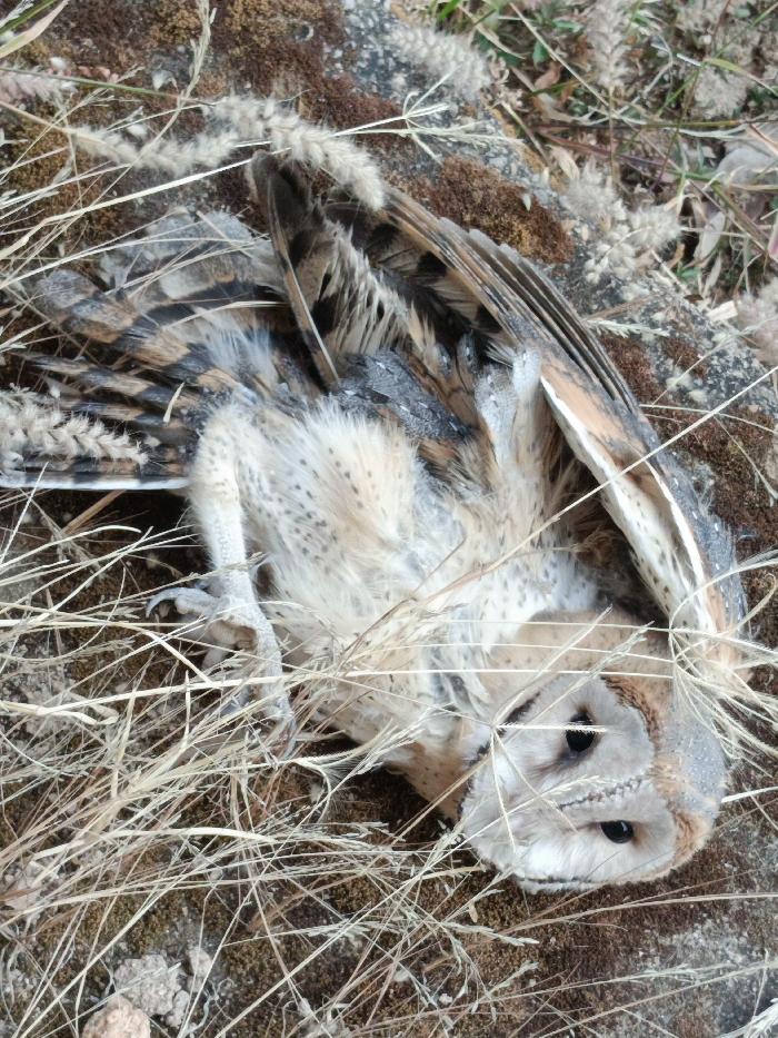 - "A deceased barn owl (Tyto alba) is depicted lying on its back on a patch of ground in Kura, Nigeria" by FM-uR1S93, licensed under CC BY 4.0