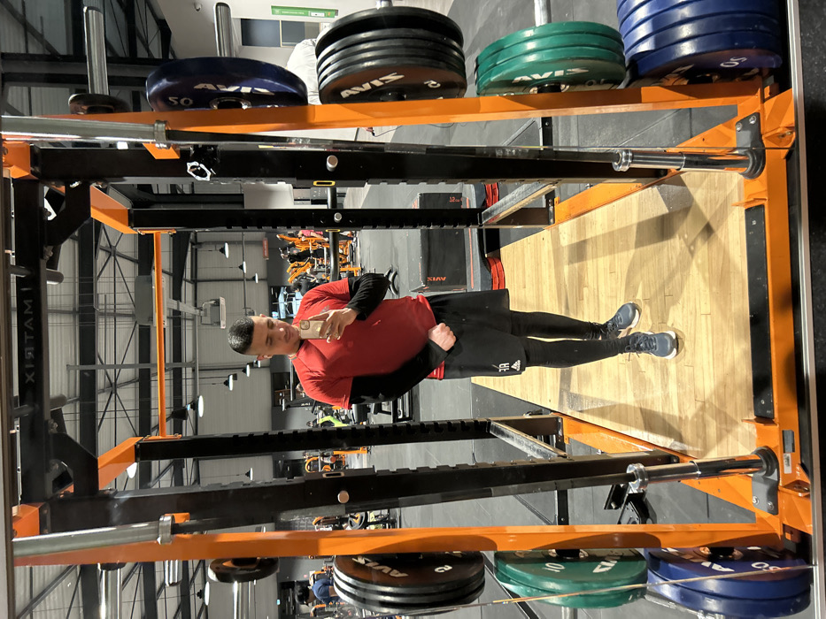 In a gym, a man stands in a squat rack taking a selfie