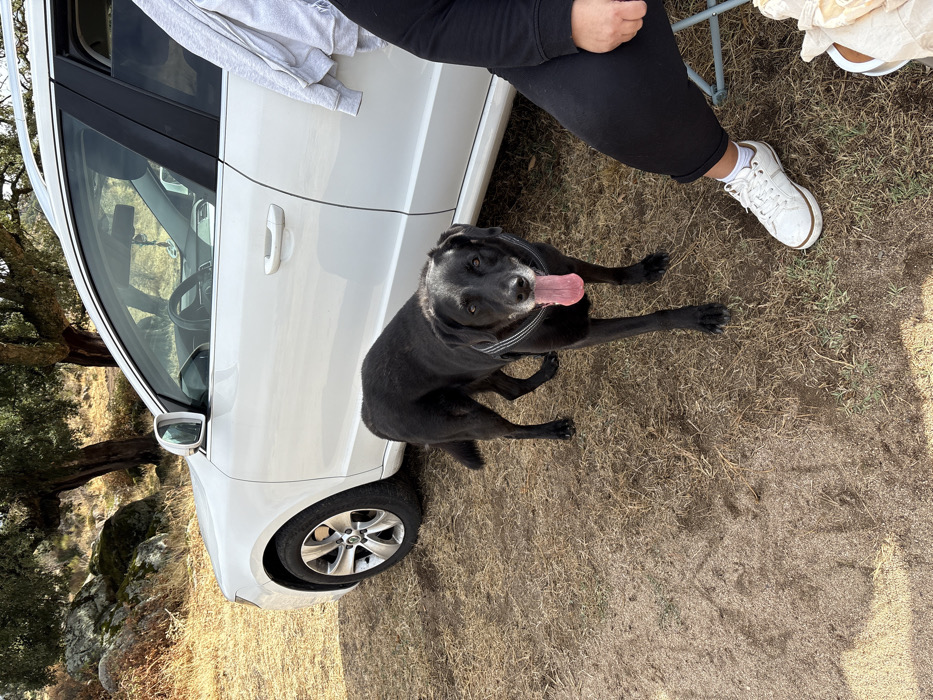 The scene depicts an outdoor setting in a natural, unpaved area near Plasencia, Spain, characterized by dry ground, scattered trees, and rocky outcrops. A black Labrador Retriever-type dog with a grey muzzle and brow stands in the central foreground, facing the camera directly. The dog is wearing a dark harness with light-colored stripes. Its mouth is open, and a pink tongue is extended. To the right, the lower body of a person is visible, seated on a grey portable camping chair. The person is wearing black pants and white sneakers with brown trim and white socks. Their right hand is visible, resting on their lap and holding a brown paper bag or container. A white SUV or crossover vehicle is parked to the left and behind the dog. It features roof rails and appears to be a four-door model. A light grey hooded garment is draped over the top frame of the rear passenger door. The front passenger window is visible, revealing parts of the vehicle's interior. The ground consists of dry, yellowish-brown grass and exposed dirt, with faint tracks. In the background, several trees with dark, textured bark and rocky formations are visible under bright natural light.