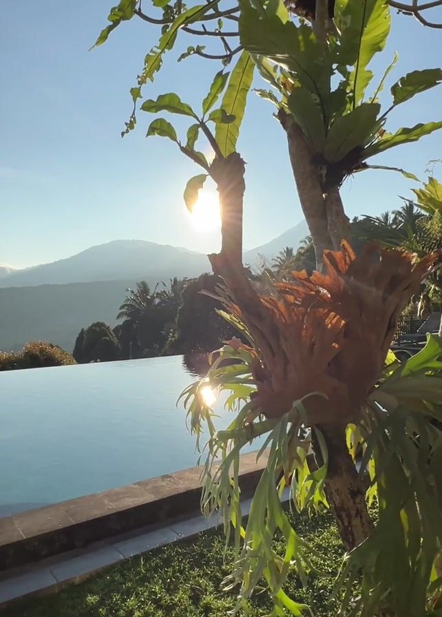 serene outdoor scene featuring a rectangular infinity pool. The pool's still, turquoise water reflects the bright sunlight, creating a shimmering effect. Behind the pool, a verdant mountain range is visible against a clear, bright blue sky. In the foreground, a tree with broad, green leaves stands prominently. Attached to its trunk is a large, brown, fan-shaped fern. The ground around the tree is covered with lush, green grass. The sun shines brightly behind the tree, partially obscuring it but creating a warm, sun-drenched atmosphere. The overall impression is one of tranquility and natural beauty.