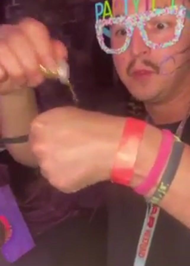 A person wearing party-themed glasses opens a container and dispenses a cloud of glitter onto their wrist