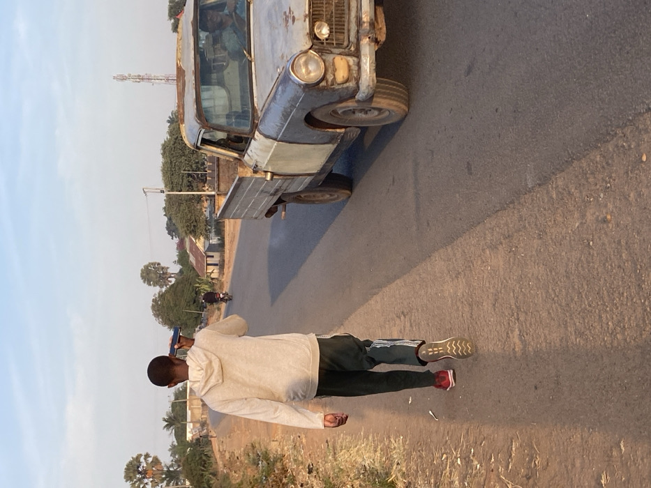 A young man lies on a road next to a vintage, rusted truck with panels jutting out the side. He wears dark green sweatpants with white stripes, mismatched shoes of red and tan, and a light-colored hoodie. The road stretches past a motorcyclist into the distance, lined with trees and low-lying vegetation. A cell tower rises prominently on the horizon under a hazy blue sky. The scene is captured with a tilted perspective.
