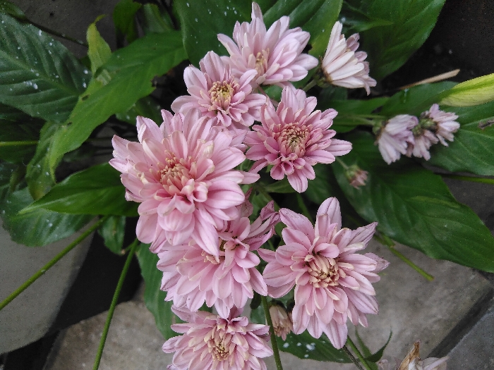 The image displays a close-up, slightly overhead view of a cluster of light pink chrysanthemum-like flowers in bloom. Approximately eight main flower heads are prominently featured, each with numerous delicate petals radiating from a compact, yellowish-orange central disc. The petals exhibit a predominantly light pink hue, with some displaying subtle color variations and lighter edges. Several flowers appear fully open and fresh, while others, particularly towards the lower right, show signs of wilting with partially closed or drooping petals. The flowers are set against a background of large, dark green leaves, some of which bear small white speckles consistent with water spots or mineral deposits. These leaves, belonging to either the same plant or another nearby peace lily-like plant, are out of focus. A textured, grey surface, resembling concrete or stone pavement, is partially visible in the upper-left and lower-left sections of the frame, also out of focus. No human figures, animals, or artificial objects, apart from the plants, are present. The scene is illuminated by diffuse lighting. The scene depicts common garden flora. While the context provided suggests the location is in Oslo, Norway, no specific architectural, geographical, or identifying landmarks are present within the image to confirm a precise location within the city.