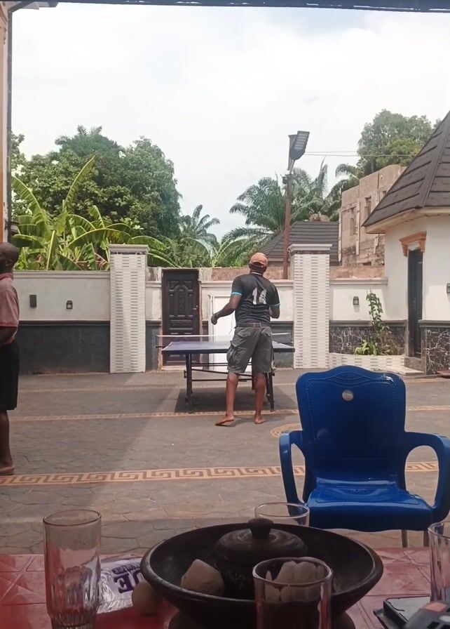A man wearing a dark shirt with the number 14 on the back, shorts, and a baseball cap is playing table tennis in an outdoor paved area. Another man wearing a white shirt serves the ball to him. The camera is looking out from a covered area, probably a porch or veranda. On the table in the foreground, there are two clear glasses, a shallow woven bowl filled with objects, a notebook, a pen, and a cell phone. The table is covered with a red tablecloth. A blue plastic chair is placed nearby. Outside, there is a fence with white columns, trees, and buildings in the background. The sky is partly cloudy.