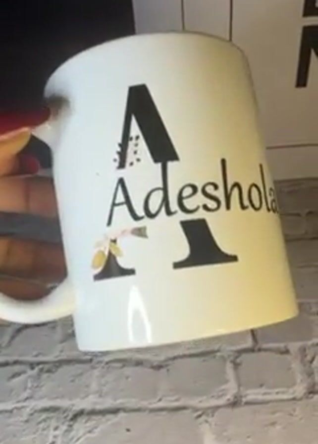 A hand with red nail polish holds a white mug against a background of a white brick wall, a black object, and a sign with black letters. The mug has a black letter "A" on the top and bottom, the name "Adeshola" written in black script in the middle, and floral designs on each "A." The hand gently tilts the mug to show the design.