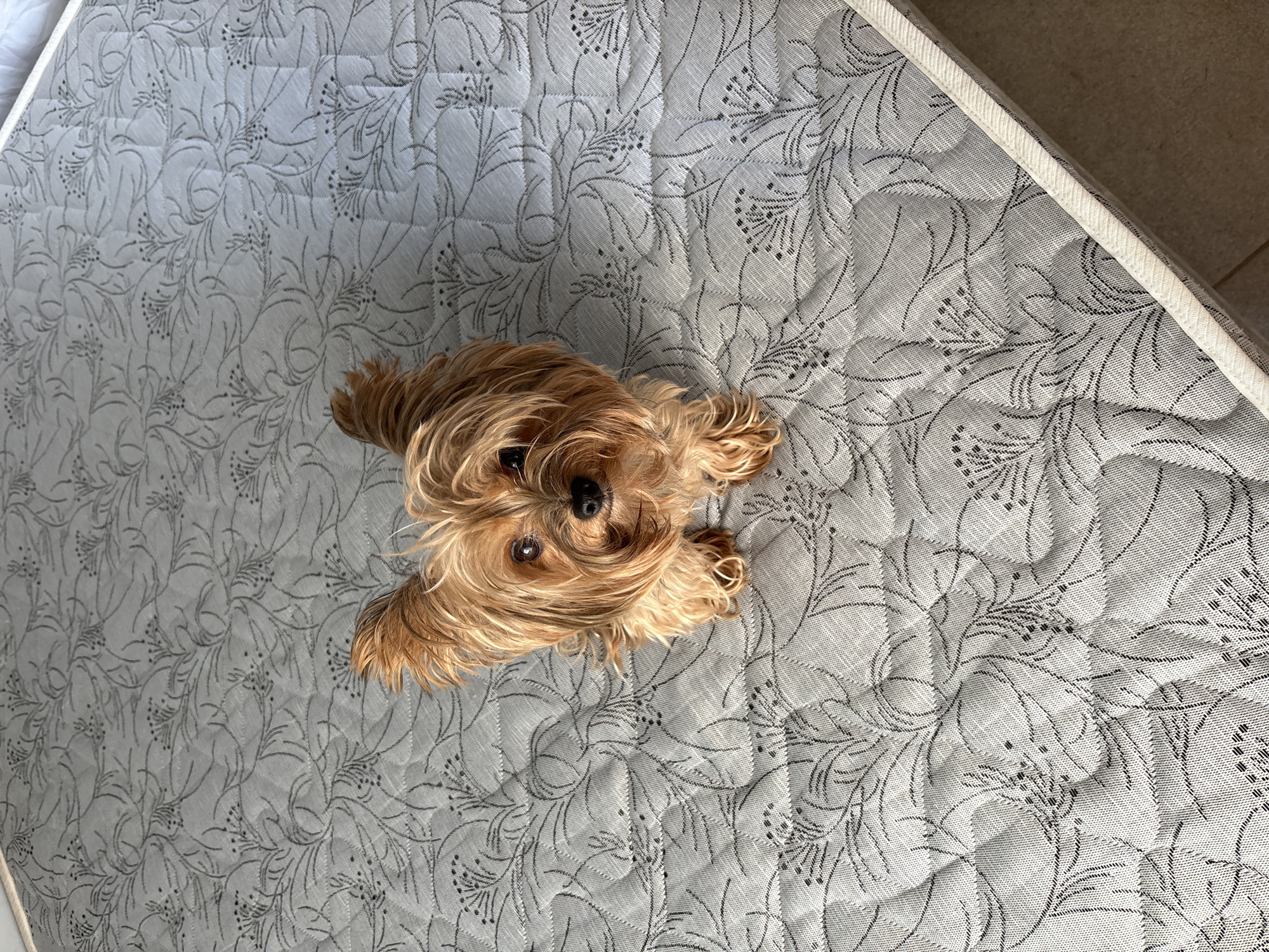 A small, brown Yorkshire Terrier-type dog is centrally positioned on a grey and white floral-patterned mattress. The mattress is situated indoors with a section of a tile floor visible in the upper right corner. The dog is looking upwards towards the camera. The location is not discernible.