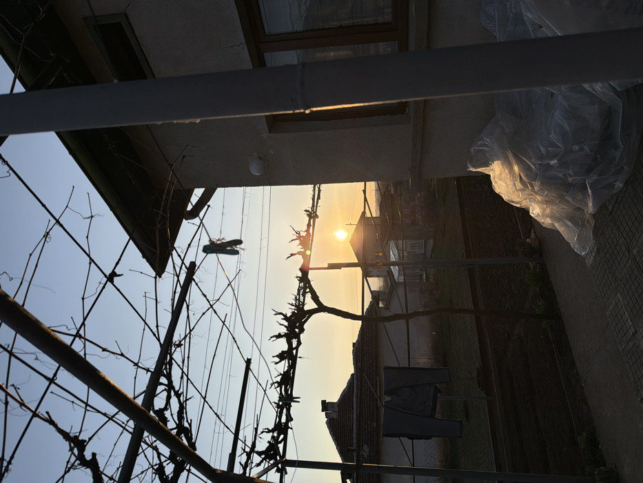 The image depicts a rural or semi-rural scene in Kravoder, Bulgaria, during either sunrise or sunset, characterized by a low sun casting warm, orange light. In the foreground, a bare grapevine trellis structure with metal support poles extends across the top of the frame. Two blue clothespins hang from a wire on the trellis. To the right, a section of a light-colored building with a dark roof overhang and a visible downspout is present. A white, round outdoor light fixture is mounted on the building's wall, which also features a window with dark framing reflecting the sunlight. A large pile of clear plastic sheeting sits on a tiled ground surface directly in front of the building, illuminated by the sun. In the midground, a garden area with dark soil is visible, enclosed by a wire fence. Two items of clothing, a dark garment and a lighter one, hang drying on a clothesline positioned over the garden. A small, bare-branched tree stands within the garden. Beyond the garden, several residential buildings with red-tiled roofs are scattered, with one distinct building directly silhouetted against the bright sun. Overhead wires, possibly utility lines, cross the scene horizontally. The background features a clear sky with a brilliant, low sun near the horizon, creating a strong golden-orange glow that illuminates the clouds and distant landscape, which appears slightly hazy. No individuals are visible in the frame.