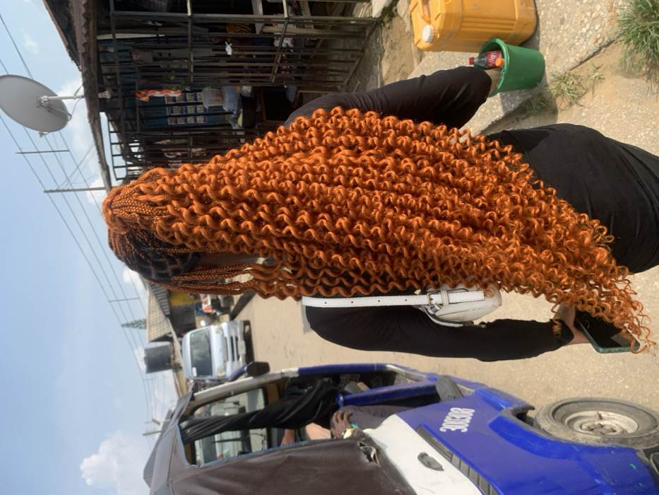 A person is depicted walking away from the camera on a street in Anantigha, Nigeria, under a clear blue sky with scattered clouds. The individual, viewed from the back, has long, bright orange, tightly curled braided hair extending below their waist. They wear a black long-sleeved garment and carry a white shoulder bag on their left side, while holding a dark green smartphone in their right hand. To the immediate left, a partially visible blue and white tricycle (keke Napep) with "300308" emblazoned on its side is present, with a passenger's arm visible inside. Further down the unpaved road, a silver van or bus is parked or driving in the distance, and other blurred vehicles are also visible. To the right of the walking individual, a concrete curb borders the path. Beyond the curb, several informal market stalls or structures are visible. One stall displays various packaged items for sale. A large white satellite dish is mounted on a pole above these structures. On the ground near the stalls, a green plastic bucket contains a red Coca-Cola bottle, positioned next to a yellow plastic jerry can. Overhead, utility lines traverse the scene. In the background, a black water tank sits on a rooftop.