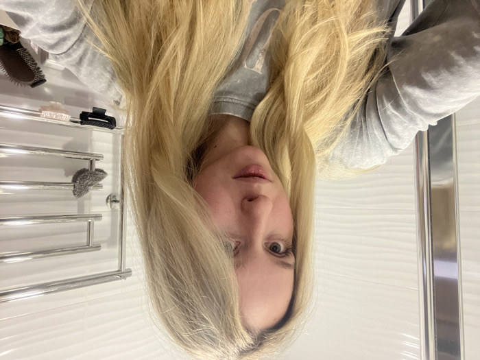 The image depicts a young adult female captured in a head-and-shoulders, eye-level shot, appearing to be a selfie taken indoors. She has long, straight, light blonde hair parted in the middle, extending past her shoulders. Her eyes are light-colored and directed towards the camera, maintaining a neutral expression. She wears a grey crew-neck sweatshirt with a faint, light-toned graphic on the front. The background is a bathroom environment. The wall behind her is covered in white, horizontally oriented rectangular tiles featuring a subtle, wavy relief pattern. To the viewer's left, a vertical, chrome-finished metallic strip is visible, likely a component of a shower enclosure. To the viewer's right, a chrome heated towel warmer is mounted on the wall. A dark grey, textured bath sponge hangs from one of the towel warmer's horizontal bars. Below this, a black hair clip is visible, and further down, the handle and bristles of a dark-colored hairbrush are partially seen, suggesting a surface or shelf out of frame. The exact location within the city of Baranavichy, Belarus, cannot be determined from the visual information provided in the image.