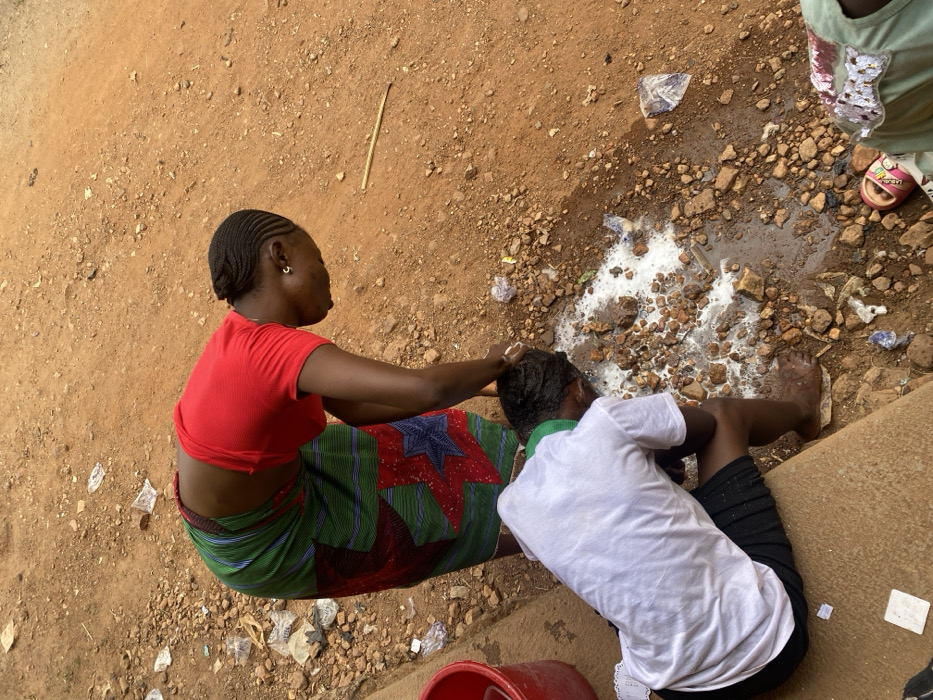 The image displays an outdoor scene in Akwanga, Nigeria, featuring three individuals on a reddish-brown dirt and gravel ground. A female, appearing to be an adult, stands wearing a red short-sleeved top and a multi-colored patterned wrapper skirt with green, red, and blue segments, including a prominent blue star. Her dark hair is braided, and a small hoop earring is visible. She is bent forward, extending her hands towards the head of a second female. This second female, appearing younger, kneels barefoot on a concrete ledge, wearing a white short-sleeved t-shirt with a green band at the neck and dark shorts. Her head is lowered into a puddle of white, foamy liquid on the unpaved ground, which is mixed with reddish-brown soil and small stones. A red plastic bucket is visible on the left. In the bottom right corner, a third individual, a child, is partially visible, wearing pink sandals and a green garment with silver sequin embellishments. The ground surrounding the subjects is unpaved, consisting of reddish-brown dirt and gravel, with scattered plastic wrappers and debris. A thin, light-colored stick lies horizontally on the dirt ground to the right of the standing female.
