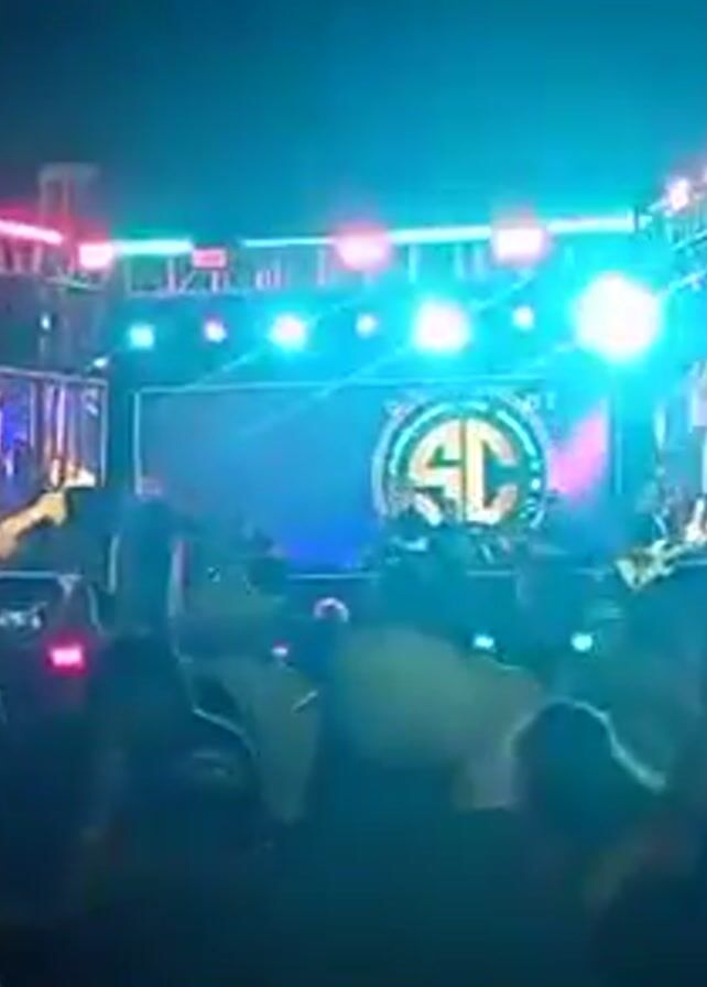 A live band performs on an outdoor stage under bright, colorful stage lights, with a circular logo reading "SC" displayed prominently on a large video screen behind them. The band consists of several members playing guitars and singing, and the audience appears to be engaged with the performance. A scaffolding structure supports the stage lighting. The video is taken from the perspective of someone in the audience.