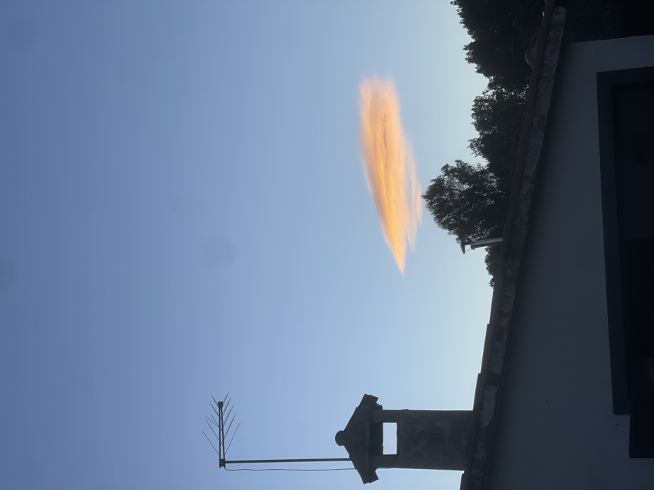 A vibrant orange cloud stands vertically in a blue sky