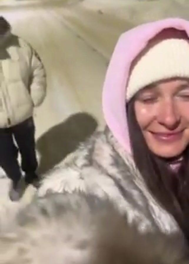 The video, taken on a snowy night, features a woman in the foreground wearing a pink hoodie under a white knit hat and a large grey and white fur-like coat