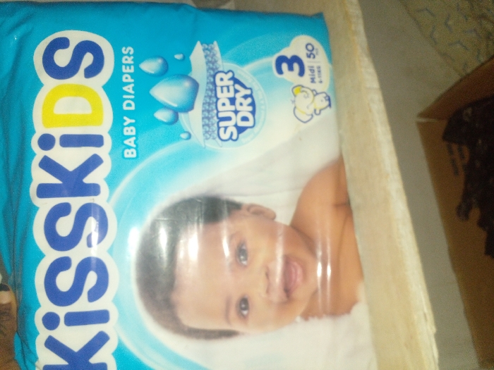 A large, blue plastic package of "KissKids Baby Diapers" is positioned prominently on a light-colored, possibly wooden, shelf in Ota, Nigeria