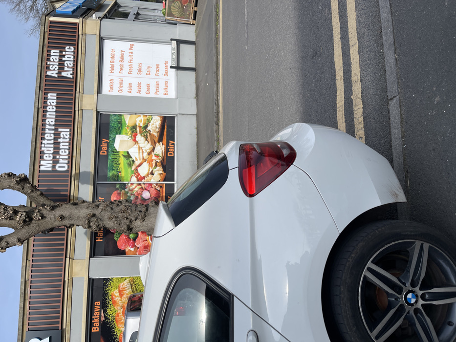 The image presents a daytime street scene on Egerton Road in Bristol, United Kingdom. In the foreground, a white BMW hatchback is parked parallel to the curb on a paved road marked with double yellow lines. The rear driver's side of the vehicle is visible, including the taillight, part of the bumper, the rear window, and the rear wheel with a BMW logo; the lower rear bumper and wheel arch show traces of dirt. Behind the car, a commercial building houses a retail establishment. Above its large display windows, a brown slatted fascia features white text reading "Mediterranean Oriental" and "Asian Arabic." The shop windows display photographic posters: one depicts baklava, another shows various meat cuts (labeled "Halal" in one of the crops, though partially obscured in the main image), and a third illustrates an assortment of cheeses (labeled "Dairy"). To the right, a vertical white sign lists services and products: "Turkish Halal Butcher, Oriental Fresh Bakery, Asian Fresh Fruit & Veg, Arabic Spices, Greek Dairy, Persian Frozen, Balkans Desserts." A white street sign identifying "EGERTON ROAD" is affixed to the building wall below this list. A mature, leafless tree with a prominent gnarled trunk stands directly in front of the shop, partially obscuring the windows and facade. The scene is illuminated by clear daylight, creating reflections on the car and shop windows. No individuals are present in the frame.