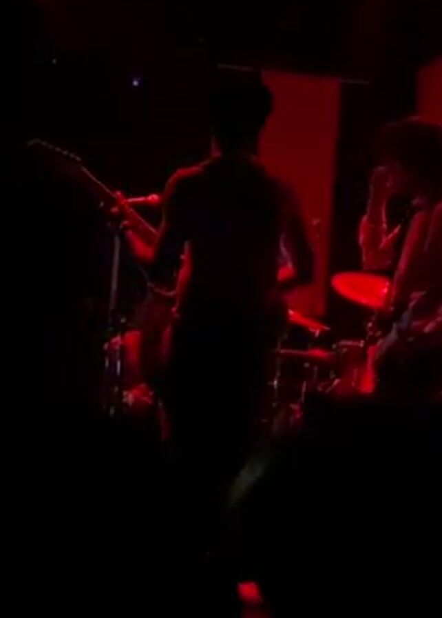 The video depicts a live music performance in a dimly lit venue, illuminated with red lighting