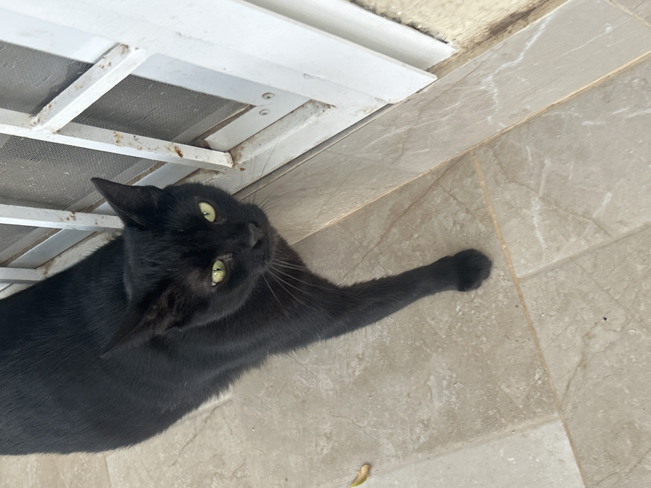- "A solid black domestic cat with bright green eyes is positioned in a walking or standing posture on a light-colored, square-tiled floor, its head turned towards the viewer" by FM-sApNa2, licensed under CC BY 4.0