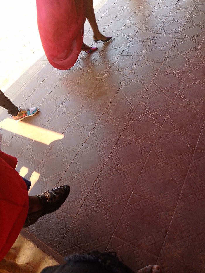The scene, located in Nsugbe, Nigeria, depicts a low-angle view of a brownish-red tiled floor with a repeating Greek key pattern, illuminated by bright sunlight that casts distinct shadows