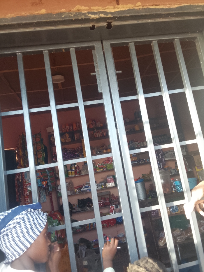 Behind a barred metal gate, a small shop's interior is visible. Shelves overflow with various products, including snacks, drinks, and household items. A child with a patterned headscarf stands close to the gate, seemingly interacting with someone outside the frame. The shop’s simple layout suggests it's a local, possibly rural, establishment. A light fixture hangs from the ceiling within the shop. The gate's design obscures some details of the interior.