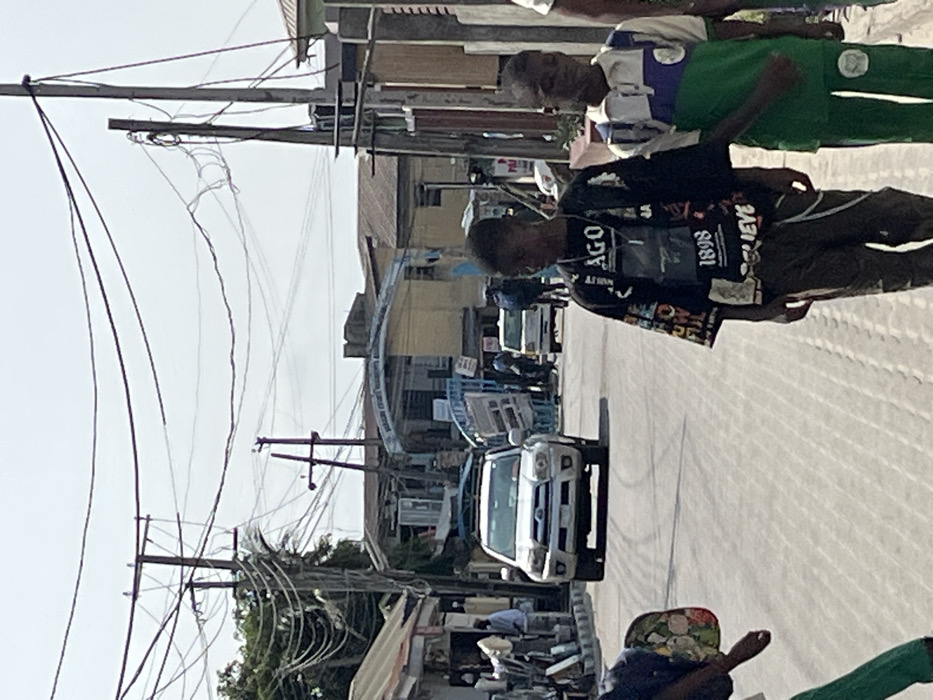 A street scene shows a white SUV driving down a road lined with buildings and power lines. People are walking on the right side of the street. A structure resembling a gate is visible further down the road. There are various objects and people scattered along the side of the street near some low buildings.