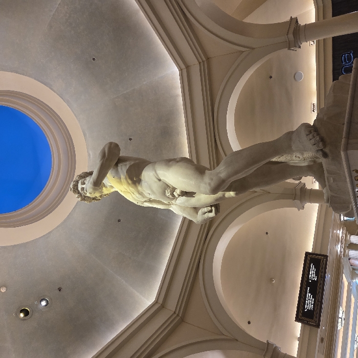 A low-angle shot captures a replica of Michelangelo's David, positioned beneath a decorative rotunda with a blue sky visible through its oculus. The marble statue is viewed against an ornate architectural backdrop of arches and pillars. A sign hangs in the background, partially obscured, with illuminated displays visible further down. The lighting casts highlights and shadows, accentuating the statue's form and the surrounding architecture.