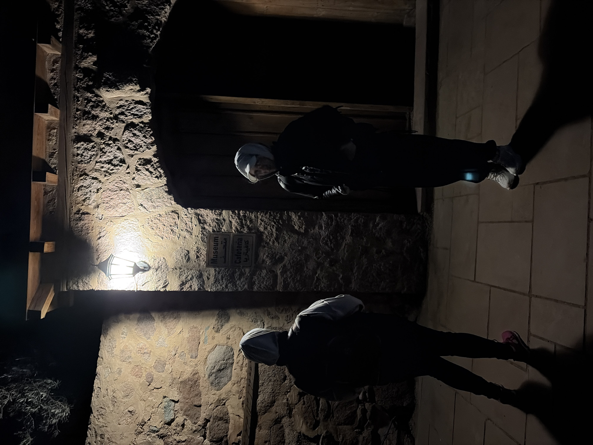 Two individuals stand in front of a stone building at night. One individual is in front of a door under a sign that reads "Museum," wearing a light-colored head covering, dark jacket, and light-colored shoes. The other individual is on the right side, wearing a light-colored head covering, dark jacket, and dark pants, and shoes. A street lamp illuminates a stone facade with visible stairs. The location sign indicates the location is Saint Catherine, Egypt.