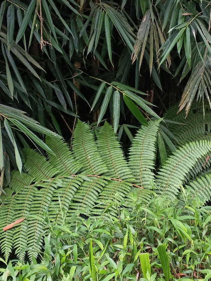 Lush greenery dominates the frame. A large fern with delicate, symmetrical fronds stretches across the center. Behind it, bamboo leaves form a dense backdrop with varying shades of green. Smaller, broader-leafed plants fill the lower section, creating a layered effect of tropical foliage. The overall impression is a dense, vibrant, and healthy natural environment.