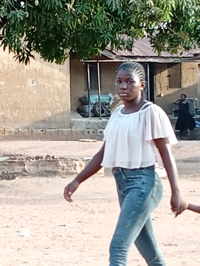 The image depicts an outdoor scene in Gboko, Nigeria. A young female, dark complexion, with closely braided cornrows, is positioned in the foreground, walking from left to right across an unpaved, light brown dirt or sand surface. She wears a white, off-shoulder, layered top and light blue denim jeans. Her left hand is visible at the lower right, clasping the hand of an individual partially out of frame. Her facial expression is neutral. In the mid-ground, behind the primary subject, a light brown, possibly adobe or concrete structure with a reddish-brown corrugated metal roof is visible. A dense, green-leafed mango tree partially overhangs this building from the left side of the frame. Below the tree, near the building, a section of a concrete or brick wall is present. Adjacent to the building, a metal framework, possibly part of a gate or stand, is visible. Stacked objects, appearing to be tires or sacks partially covered by blue material, are positioned near the base of the building. Further in the background to the right, a second female figure, dark-skinned and wearing a dark dress, stands partially visible near another distant structure.