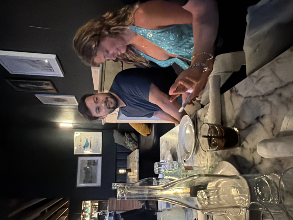 The image depicts an interior scene within Lucky's Steakhouse Malibu, United States of America. Two individuals are seated at a marble-top dining table. A male, appearing to be in his mid-30s with short dark hair and a beard, is positioned on the left, wearing a dark blue t-shirt and looking to his right with a slight smile. A female, appearing to be in her late 20s or early 30s with long wavy blonde hair, is seated to the right, wearing a light blue sequined halter top with a plunging neckline and a silver cross pendant. She is actively engaged with a white smartphone held in both hands, looking down at the screen. A silver charm bracelet is visible on her left wrist. The table in the foreground features several objects: a tall, empty clear glass bottle; a glass containing a dark beverage with ice and a dark straw; a stack of three clear drinking glasses; a small green Coca-Cola bottle; and an empty white ceramic plate. White cloth napkins are folded on the table. The background consists of dark-colored walls adorned with framed artwork. A distinct poster featuring a blue bird and the text "les lalannes" is visible on the wall behind the male subject. Other framed prints and photographs are present. A vertical wall sconce emits warm light. Dark banquette seating with a yellow and a grey pillow is visible further back. To the far left, a dimly lit bar area with bottles and glassware can be seen, and a wooden beam ceiling structure is overhead. Another dining table with a lit lamp is visible behind the main subjects. The scene appears to be a casual dining or social setting.