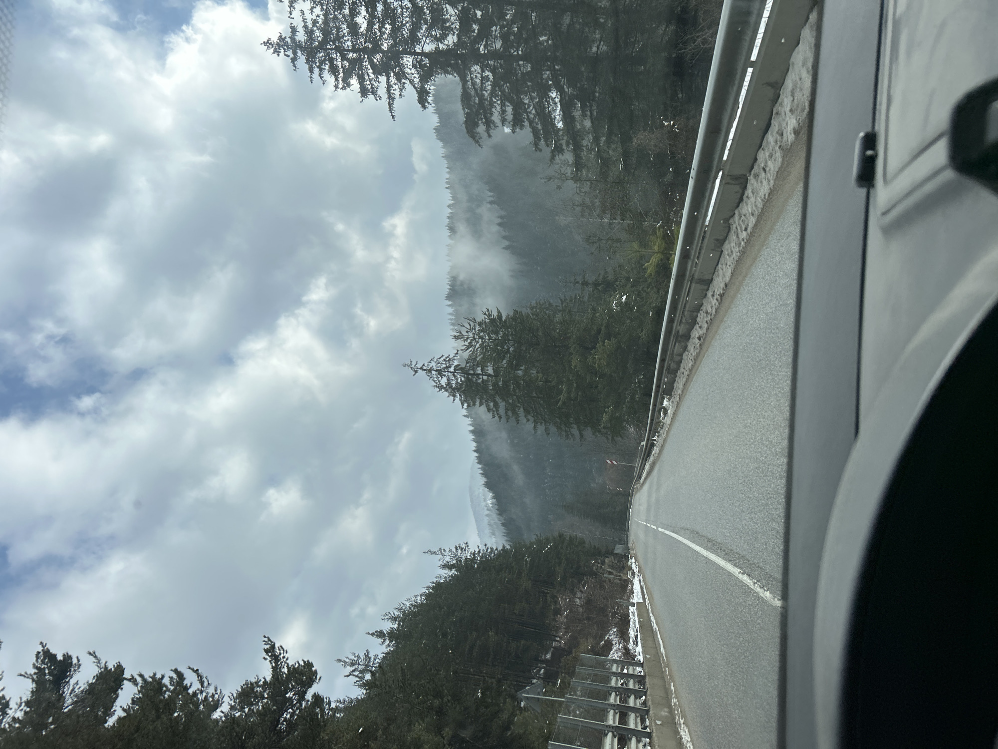 The image depicts a two-lane asphalt road traversing a mountainous, heavily forested area in Dryanovets, Bulgaria, observed from inside a vehicle. The sky above is partially covered by large, diffuse white and grey clouds, with patches of lighter blue visible. The road, which appears damp, features a solid white center line that curves gently to the right as it recedes into the distance. On the immediate right side of the road, a silver metal guardrail runs parallel to the pavement, with patches of snow and slush visible on the ground directly beside and beneath it. Beyond the guardrail, dense evergreen trees cover the steep hillside. Further into the background on the right, forested mountains rise, partially obscured by a low-hanging mist or cloud cover. A small red and white striped road marker is faintly visible on the right shoulder in the mid-distance. On the left side of the road, a more substantial barrier system, including a metal guardrail and a section of mesh fencing, separates the roadway from a steep, forested incline. Snow accumulation is present on the ground adjacent to the barrier and scattered among the trees on the hillside. The entire landscape is dominated by a thick coniferous forest, with the distant mountain peaks shrouded in fog. In the immediate foreground, the top of a vehicle's dashboard and a segment of a steering wheel are visible at the bottom of the frame, indicating the photograph was captured from the driver's or passenger's perspective through the windshield. No individuals are present in the visible scene.