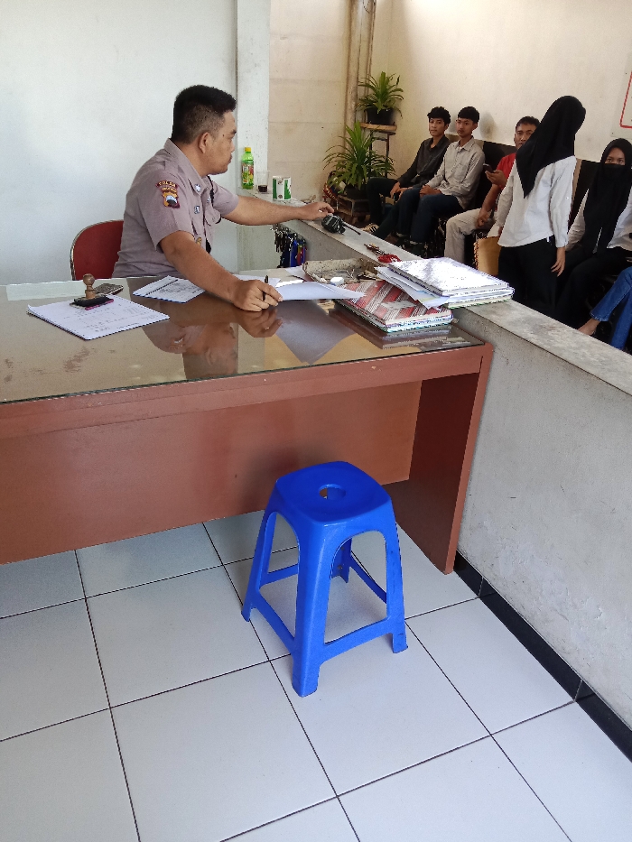 A man in a police uniform sits at a desk, writing on a paper. A stamp and various papers rest on the desk. A group of people are seated in the background, including individuals wearing headscarves. A blue plastic stool stands beneath the desk, positioned on a tiled floor. A potted plant is visible behind the seated people.